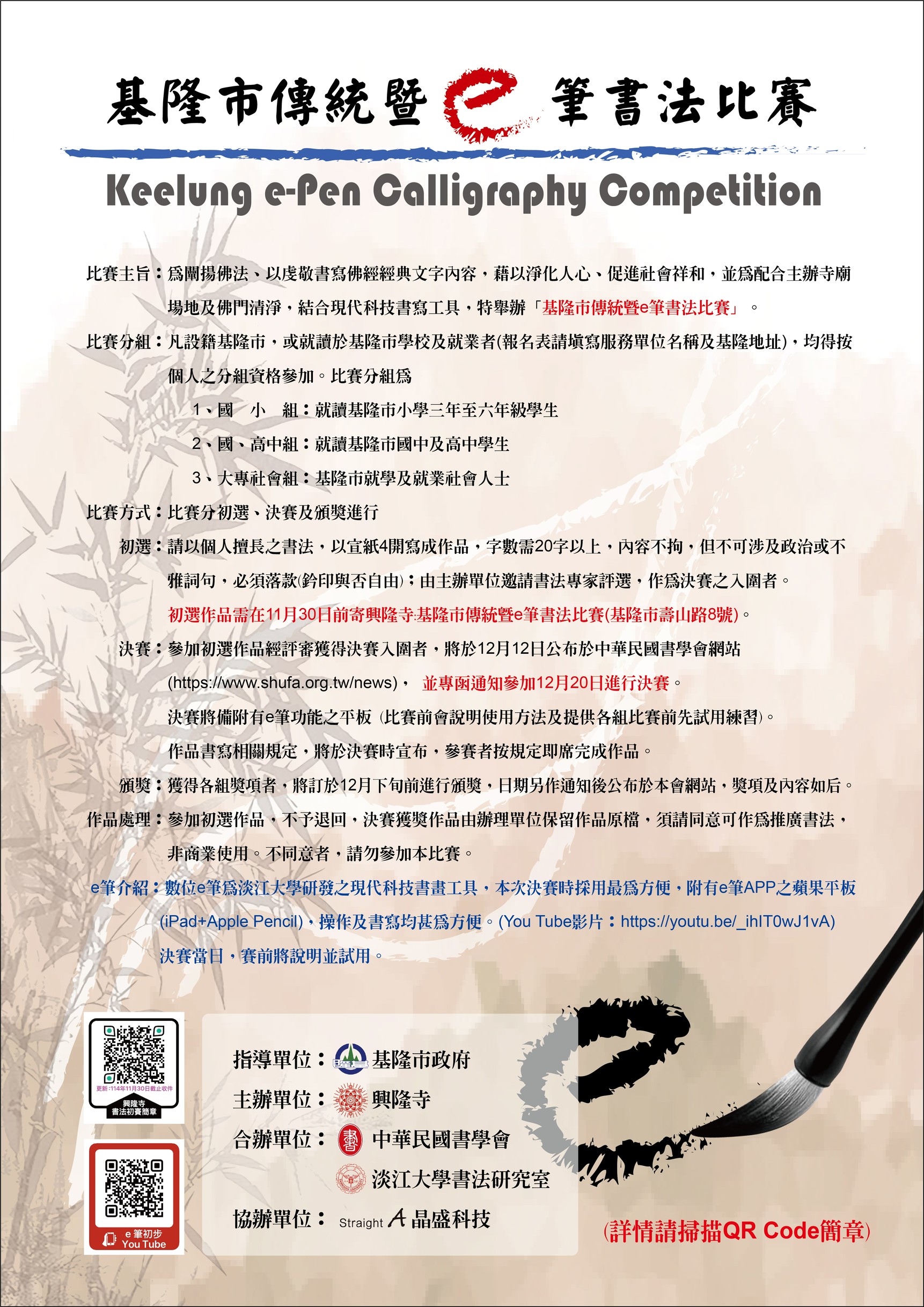 | 公告主旨 | 興隆寺辦理「基隆市傳統暨 e 筆書法比賽簡章 」延長參賽時間至114年11月30日 |
